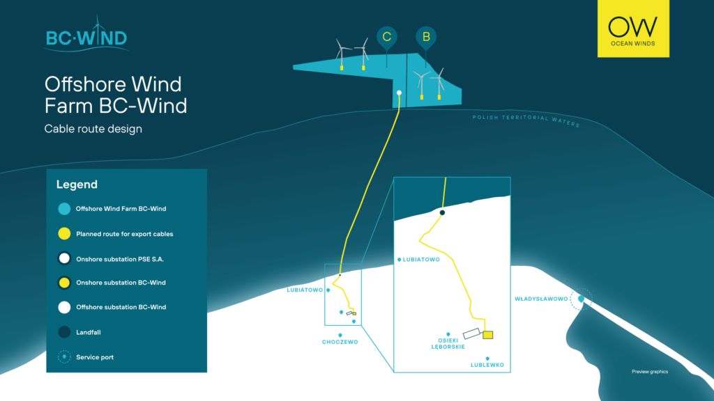 BC-Wind is an offshore wind farm project located approximately 23 kilometers north of the shore, near the municipalities of Krokowa and Choczewo in the Pomeranian Voivodeship. The project aims to achieve a planned capacity of up to 500 MW, with a total farm area of 90.94 km².
